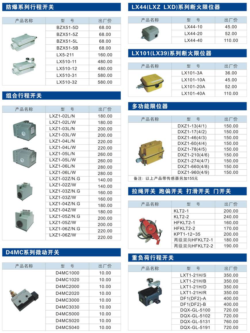 防爆系列行程开关、船用系列行程开关、组合行程开关、D4MC系列微动开关、LX44(LXZ LXD)系列断火限位器、LX101(LX39)系列断火限位器、多功能限位器、拉绳开关、跑偏开关 、打滑开关、门开关、重负荷行程开